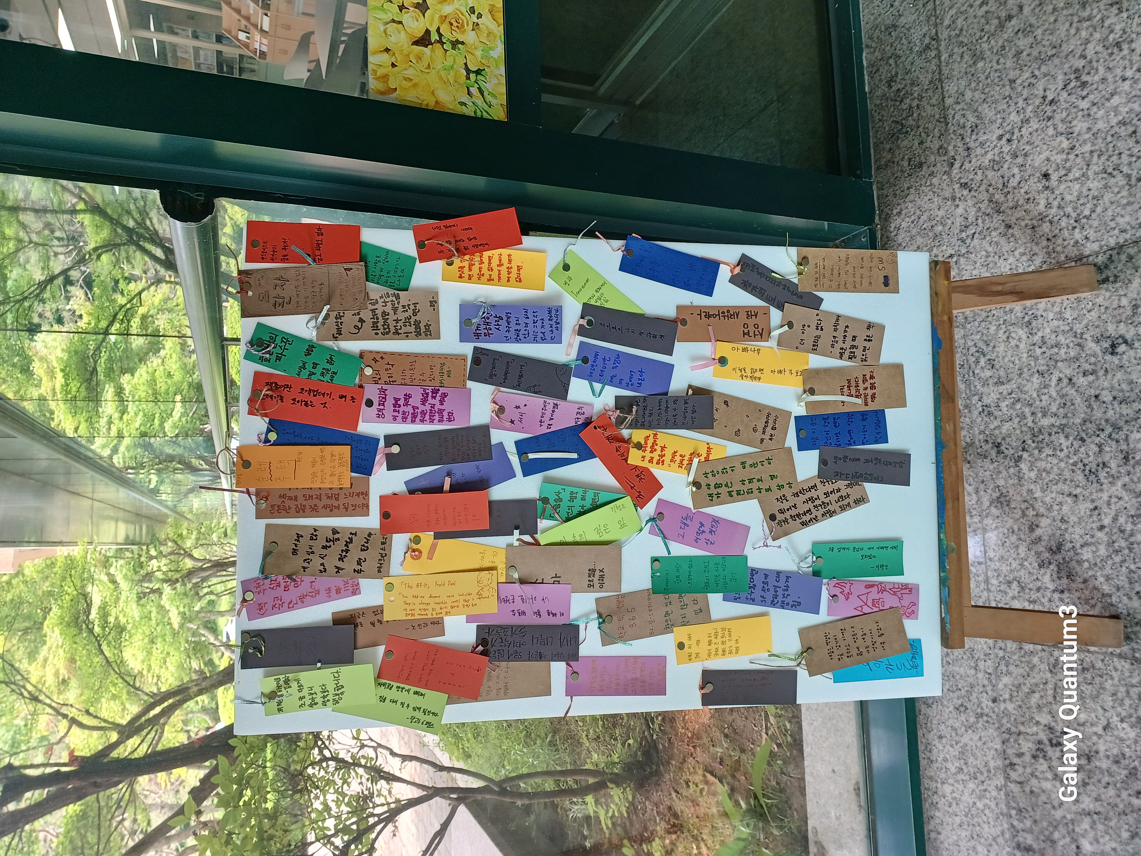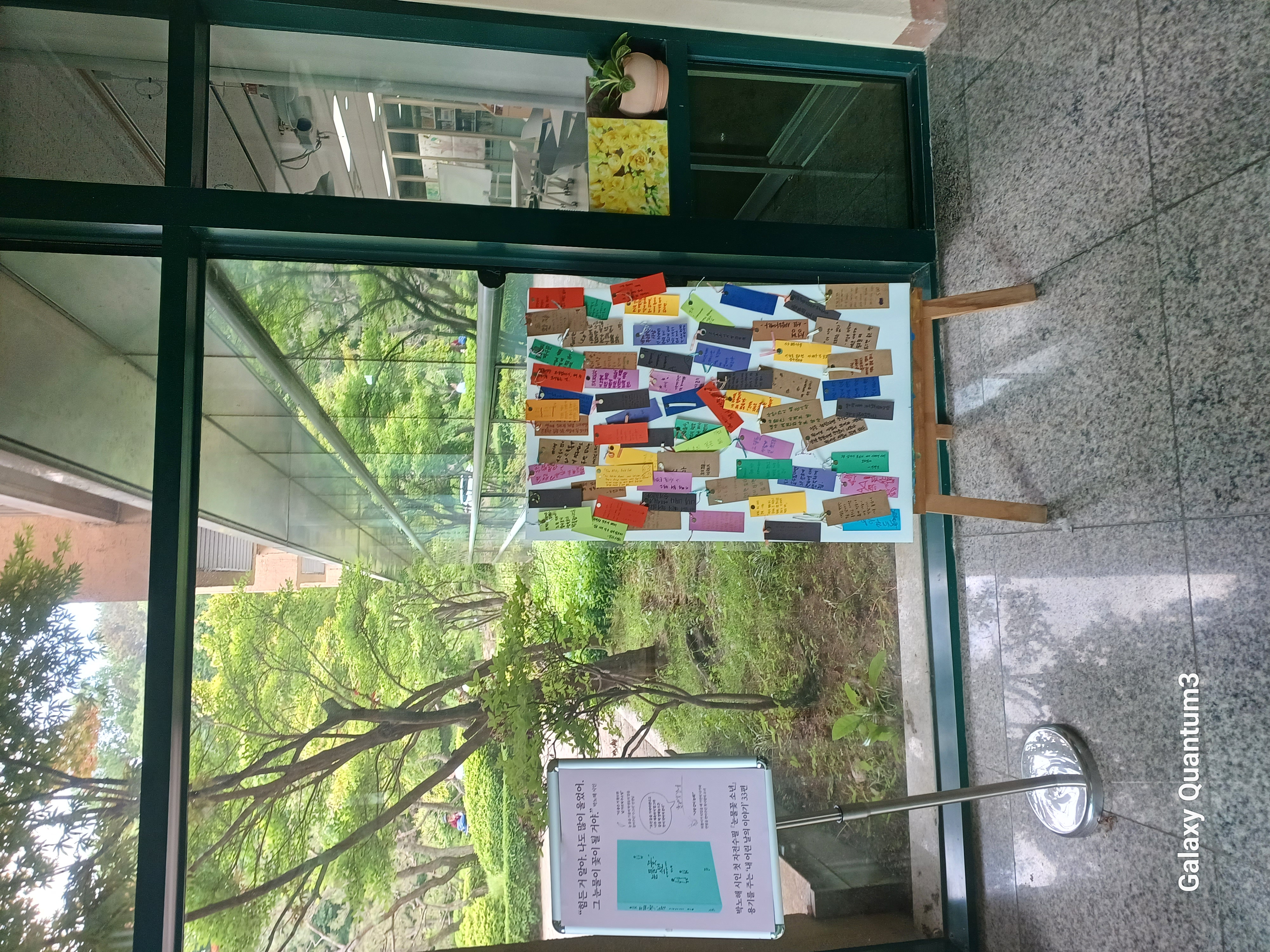 도서관에서 학생들이 책을 읽고 한 줄 평을 쓴 종이를 밖에 전시했습니다.