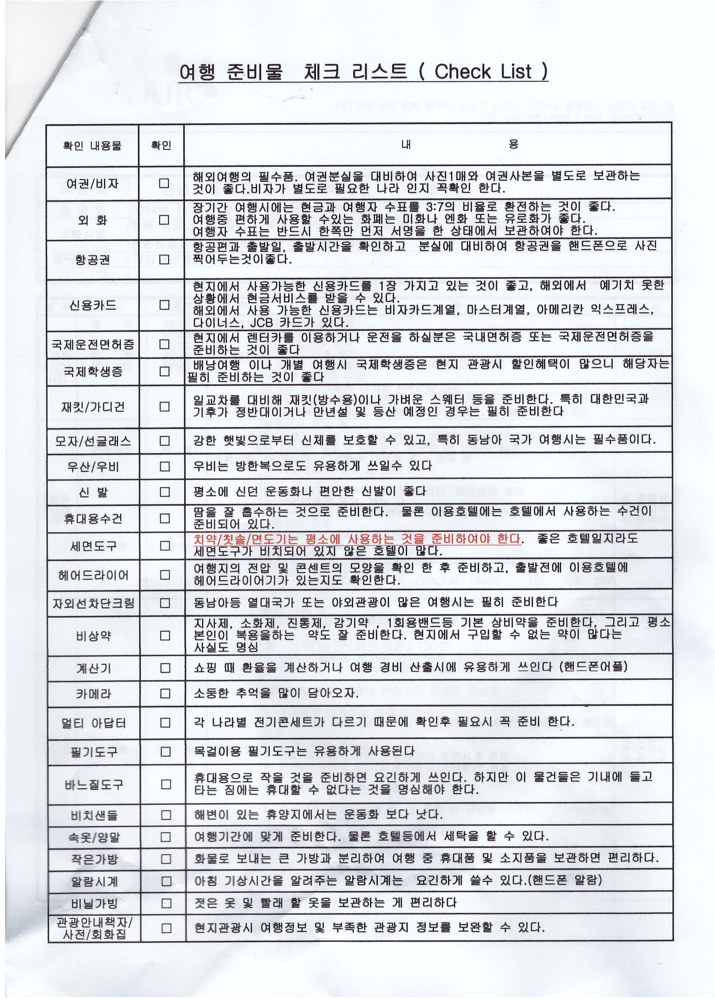 떠나기전 사전 준비물을 붙임과 같이 게시해 드리오니, 주말을 통해