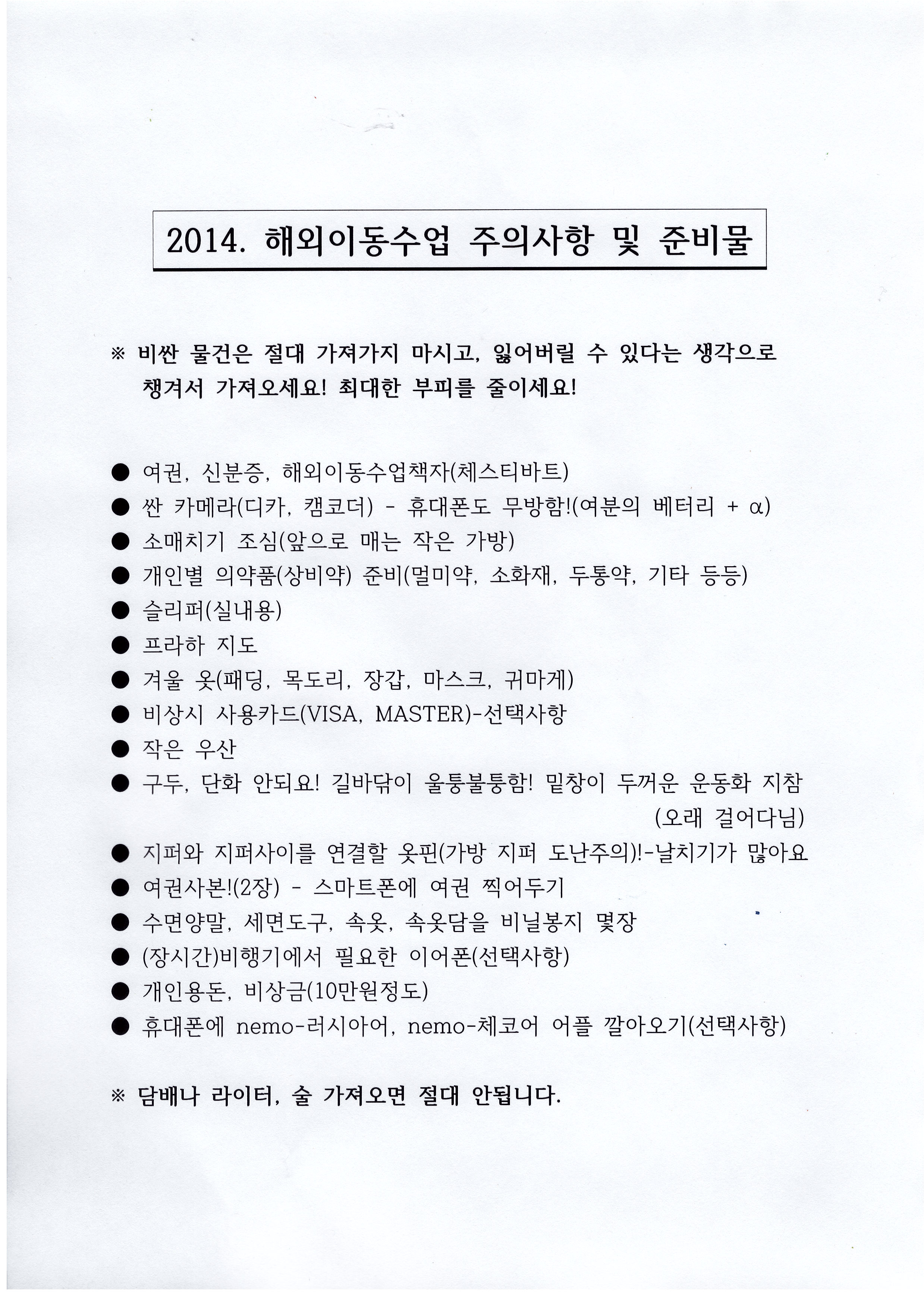 2014학년도 2학년 동유럽 해외이동수업 준비물