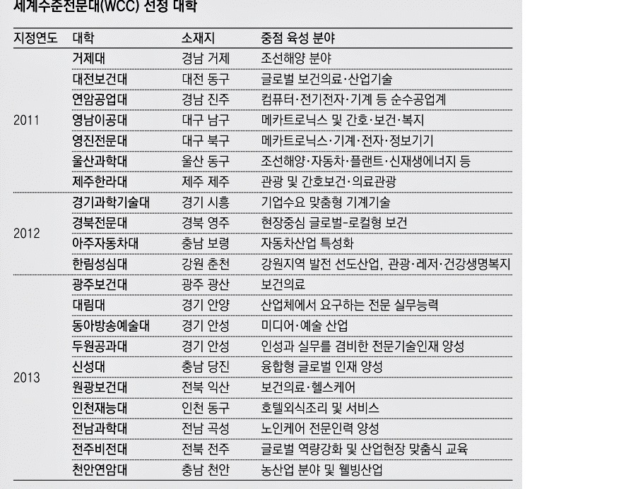 2011~2013년 지정 세계적 수준의 전문대학(World Class College, WCC)