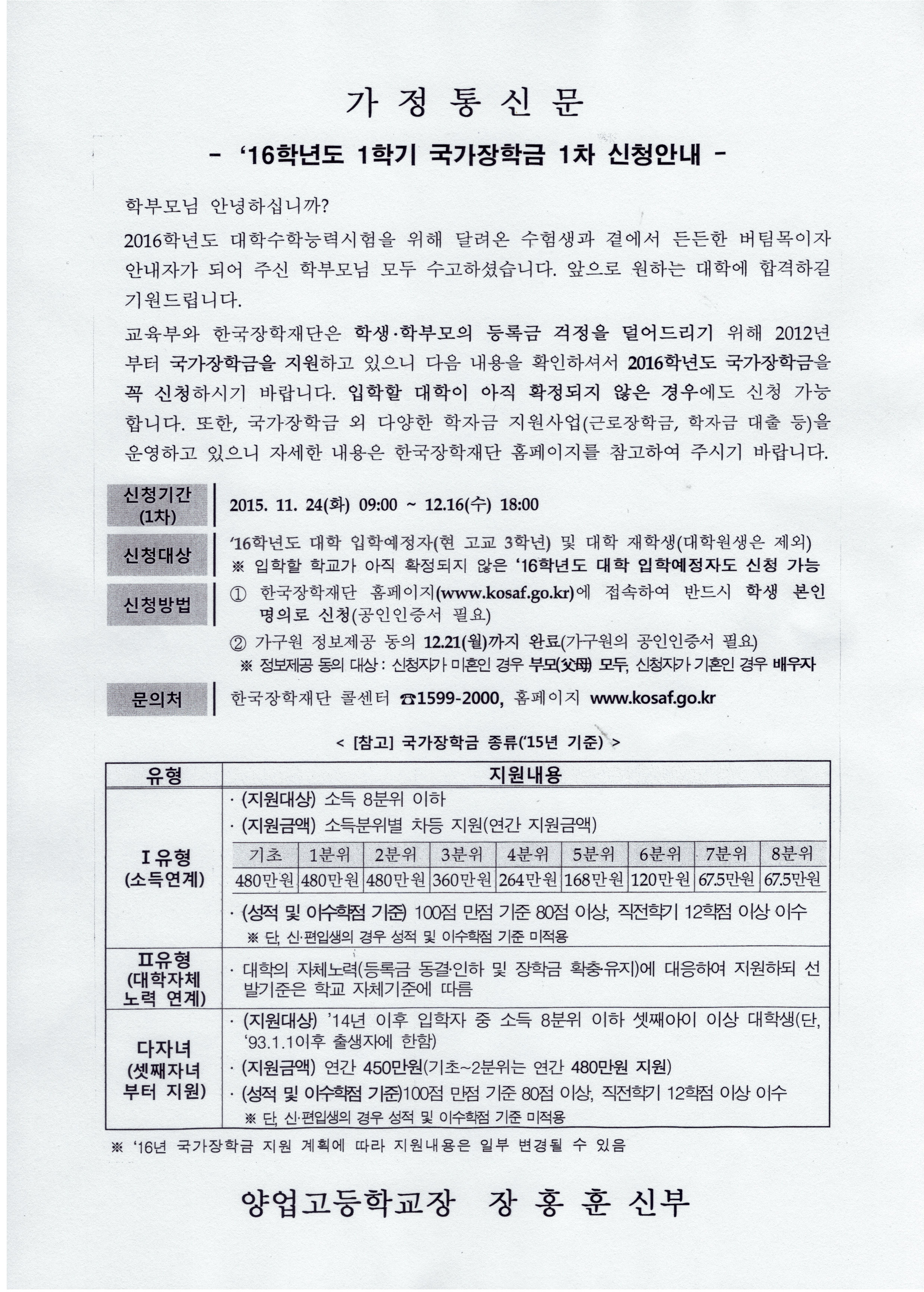 3학년 2016년도 대학 국가 장학금과 관련하여 가정통신문 공지