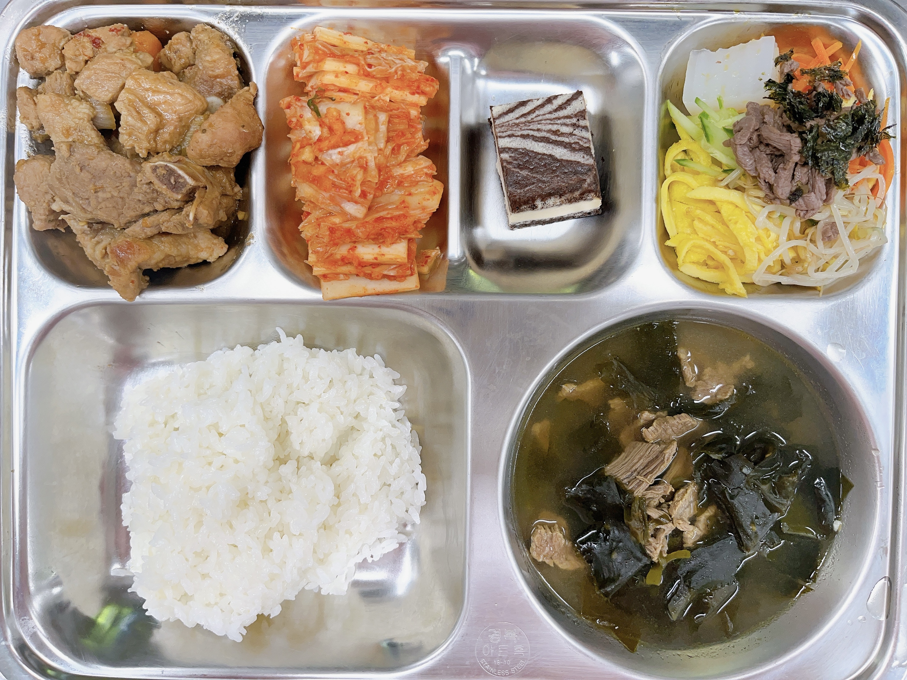 | 친환경쌀밥 한우미역국(5.6.13.16.18.) 탕평채(1.5.6.13.16.) 돼지갈비찜(5.6.10.12.13.18.) 배추김치(9.13.) 티라미슈케익(1.2.5.6.) |