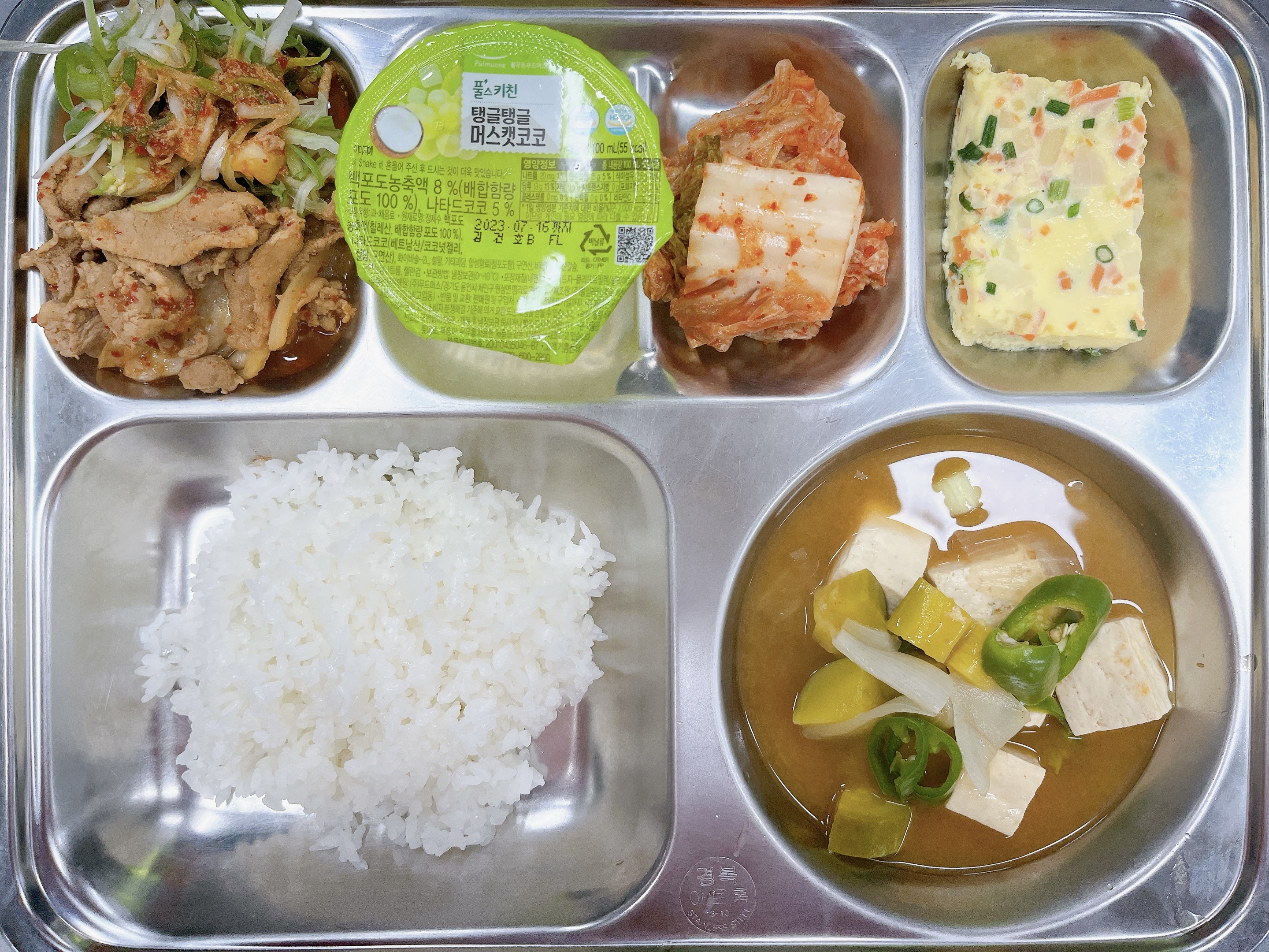 | 친환경쌀밥 풋고추된장국(5.6.13.18.) 계란찜(1.5.13.) 돈육파채불고기(5.6.10.13.18.) 배추김치(9.13.)/머스캣에이드(5.13.) |