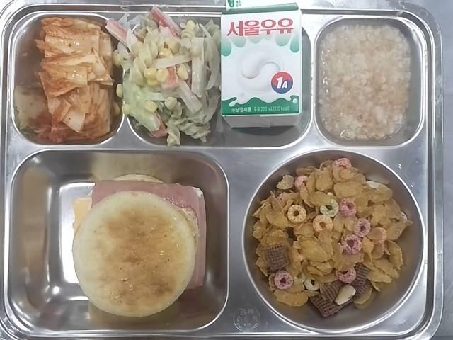 조식: 숭늉, 배추김치, 햄치즈샌드위치, 푸실리샐러드, 시리얼+우유