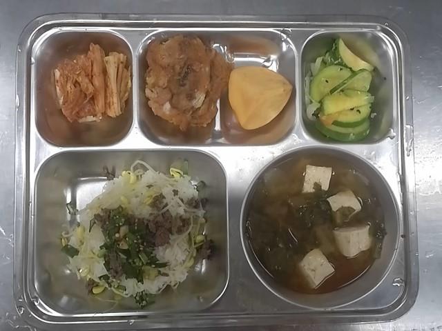 중식: 한우콩나물밥, 얼갈이된장국, 애호박새우젓볶음, 오징어긴치전, 배추김치,단감