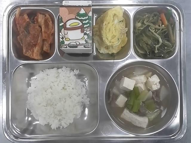 조식: 쌀밥, 소고기무국, 야채계란말이, 미역줄기팽이볶음, 배추김치, 초코우유'
