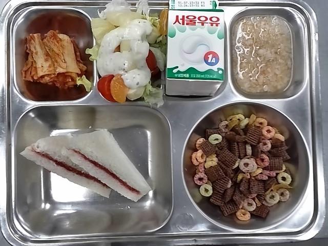 조식: 숭늉, 배추김치, 토스트+잼, 시리얼+우유, 과일샐러드/요구르트드레싱