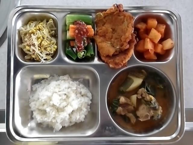 중식: 현미찹쌀밥, 돈등뼈감자탕, 오징어김치전, 콩나물무침, 석박지, 야채스틱/쌈장