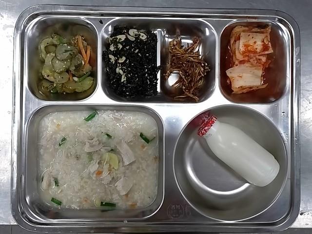 조식: 영양닭죽, 오이지무침, 고추장멸치볶음, 아몬드파래자반, 배추김치, 장액티브요구르트