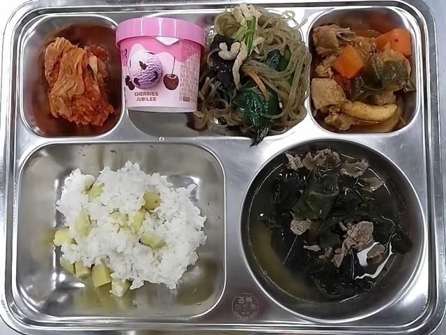 중식: 고구마밥, 한우미역국,매운돼지갈비찜, 부추고기잡채, 배추김치, 체리쥬빌레아이스크