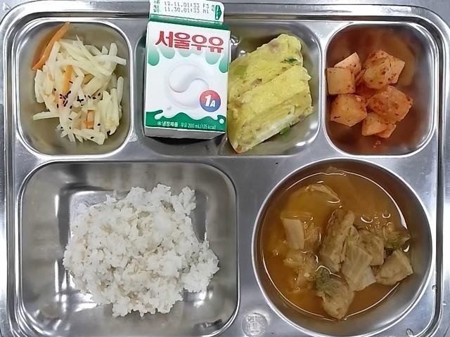 조식: 발아찰현미밥, 김치어묵국, 감자채볶음, 야채계란말이, 깍두기, 우유