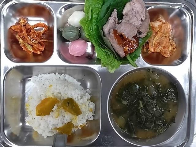 중식: 단호박밥, 근대된장국, 목살구이/마늘/쌈장, 무말랭이무침,삼색꿀떡,상추깻잎쌈