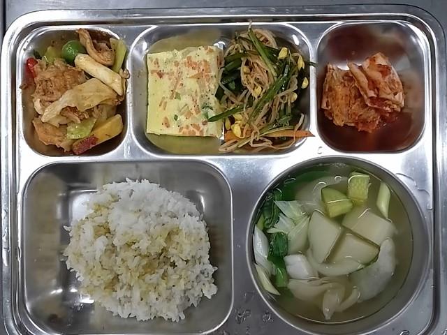 석식: 기장밥, 감자수제비국, 맛살계란찜, 철판닭갈비, 콩나물부추무침, 배추김치