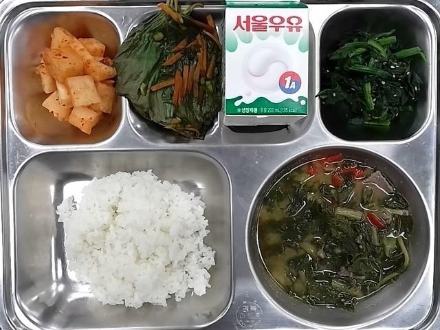 조식: 쌀밥, 시래기된장국, 깻잎찜, 시금치무침, 깍두기, 우유