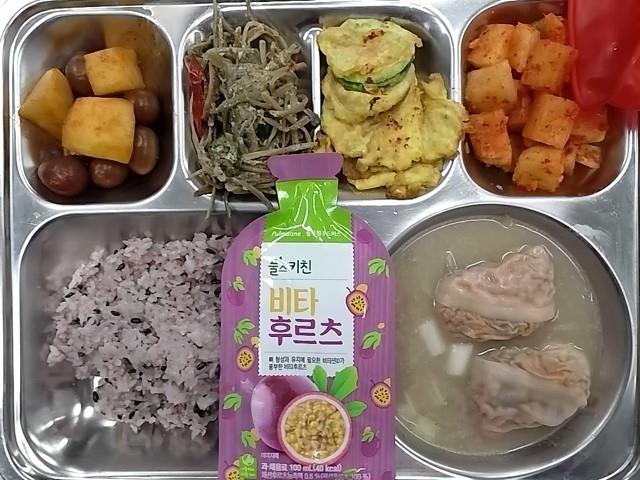중식: 찰흑미밥, 김치만두전골, 고구마순볶음, 애호박전, 깍두기, 비타후르츠,메알감자조림(매콤)