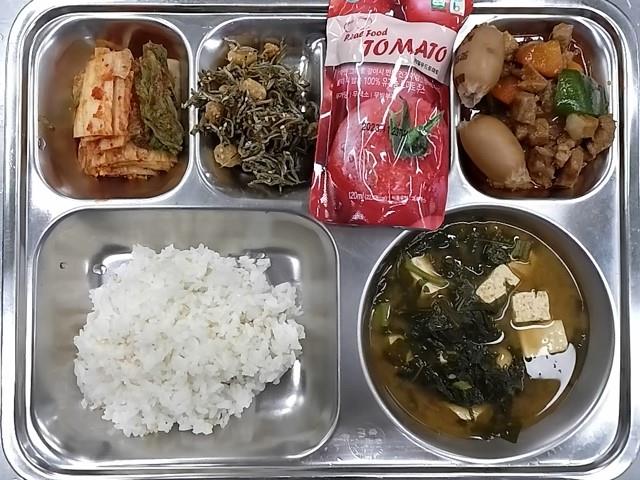 중식: 현미찹쌀밥, 목살큐브스테이크, 아욱된장국, 멸치찹쌀콩조림,배추김치, 토마토주스