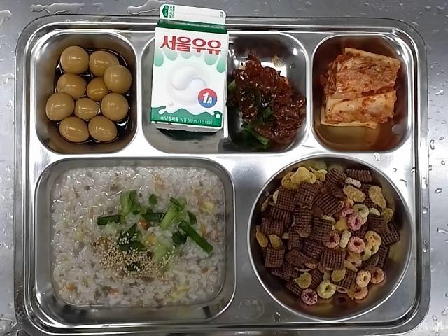 조식: 쇠고기죽, 오복채무침, 메추리알장조림, 배추김치, 시리얼+우유