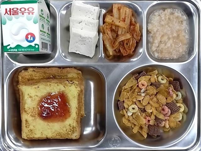 조식: 프렌치토스트, 두부/볶음김치, 숭늉, 시리얼+우유
