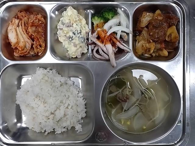 석식: 현미찹쌀밥, 쇠고기콩나물국, 감자샐러드, 오징어브로콜리숙회, 폭찹스테이크, 배추김치