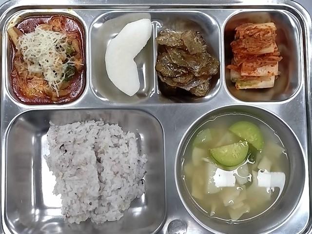 중식: 혼합10곡밥, 삼색수제비국, 눈꽃치즈불닭볶음, 쥐어채볶음, 배추김치, 배