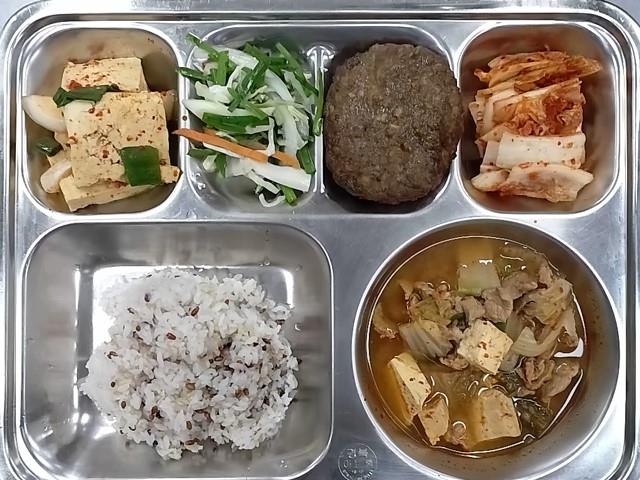 중식: 오색미밥, 두부조림, 부추겨자채, 배추김치, 돈육김치찌개, 수제떡갈비