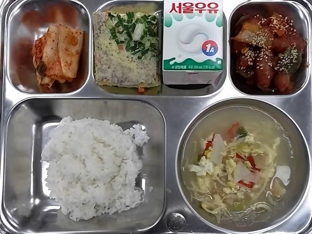 조식: 쌀밥, 북어콩나물국, 비엔나야채볶음, 옥수수계란찜, 배추김치, 우유