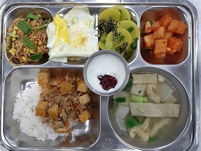 석식: 마파두부덮밥, 유부어묵국, 계란휴라이, 매콤콩나물국, 깍두기, 단무지무침, 과일요거트