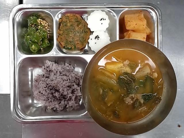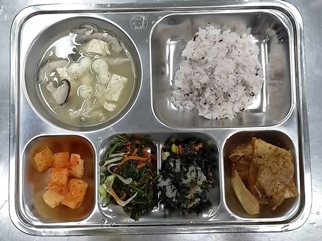 석식: 혼합15곡밥, 버섯들깨탕, 돈갈비김치찜, 시금치고추장무침, 청포묵무침, 깍두기