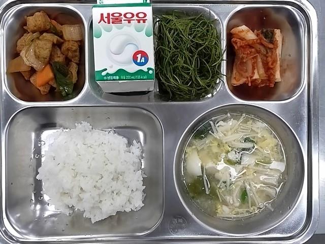 조식: 쌀밥, 순두부계란국, 비름나물무침, 어묵볶음, 배추김치, 우유