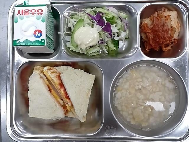 조식: 모닝샌드위치, 계란후라이, 샐러드, 우유, 숭늉, 배추김치