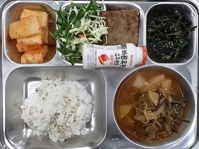 중식: 율무밥, 한우육개장, 깻잎순무침, 부추겨자채, 떡갈비, 석박지, 요구르트