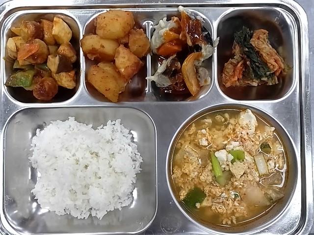석식: 쌀밥, 순두부찌개, 미트볼새송이볶음, 감자조림, 가지탕수, 배추김치
