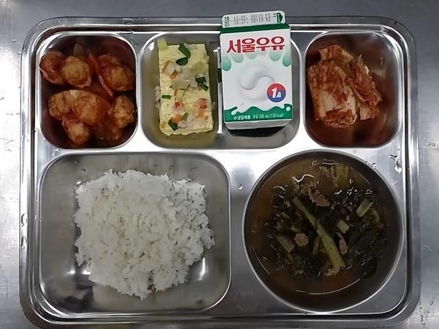 조식: 쌀밥, 시래기된장국, 미트볼조림, 야채계란찜, 배추김치, 우유