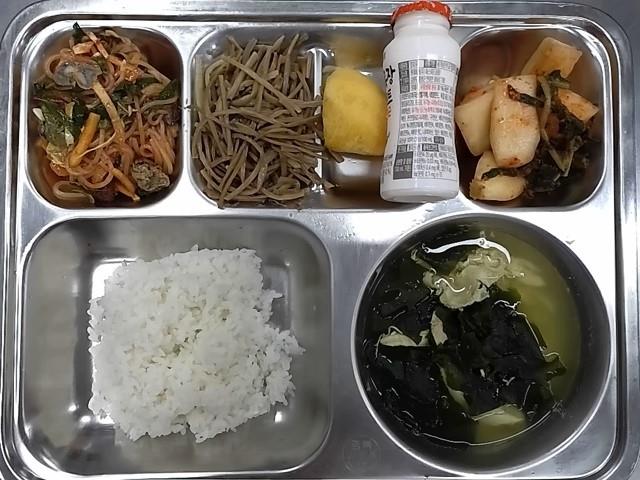 중식: 현미찹쌀밥, 닭미역국, 고구마순볶음, 골뱅이쫄면채소무침, 총각김치, 단감, 요구르트