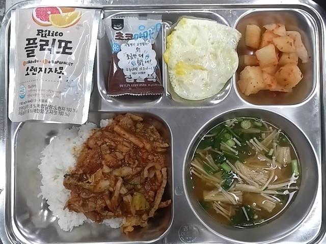 석식: 낙지볶음덮밥, 팽이된장국, 계란후라이, 깍두기, 오렌지자몽주스, 초코아이스찹쌀떡