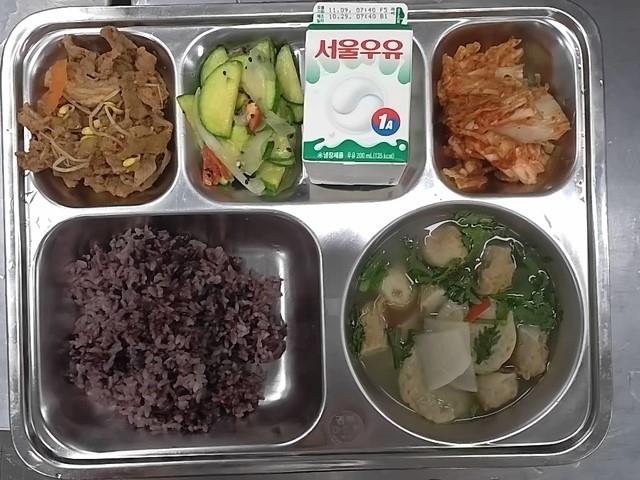 조식: 찰흑미밥, 쑥갓어묵국, 돈육콩나물볶음, 애호박새우젓볶음, 배추김치, 우유