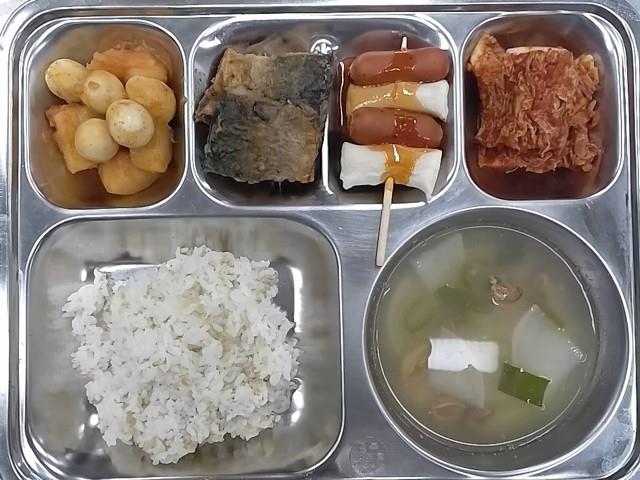 석식: 쌀보리밥, 홍합탕, 고등어구이, 메알감자조림, 배추김치, 떡꼬치