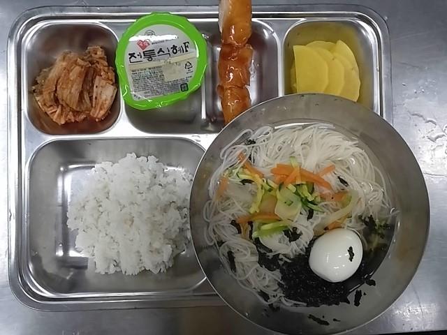중식: 쌀밥(자율), 삶은달걀, 잔치국수, 반달단무지, 배추김치, 닭꼬치/마늘간장소스, 유기농우리쌀로만든식혜