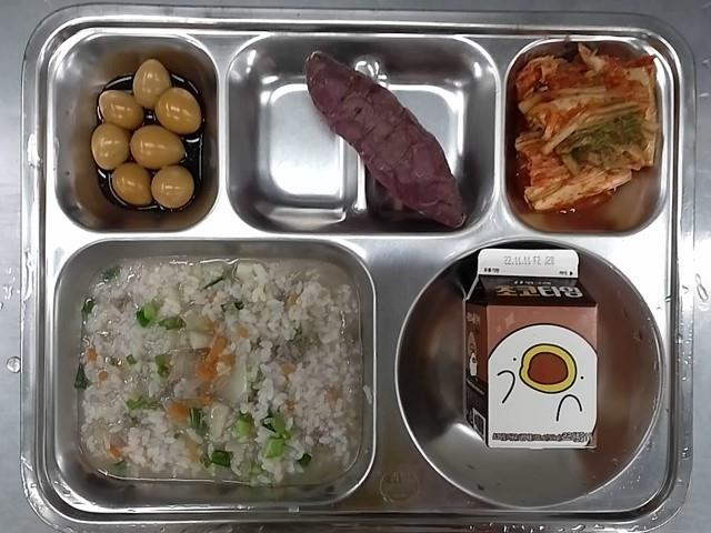 조식: 소고기야채죽, 베추리알장조림, 배추김치, 꿀고구마, 초코우유