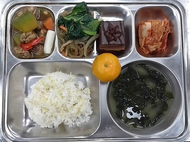 중식: 기장밥, 들깨미역국, 단호박돈육갈비찜, 잡채, 배추김치, 귤, 우리밀초코케익