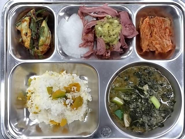 중식: 단호박밥, 아욱올갱이국, 오리훈제/머스타드소스, 오이부추무침, 배추김치, 무쌈