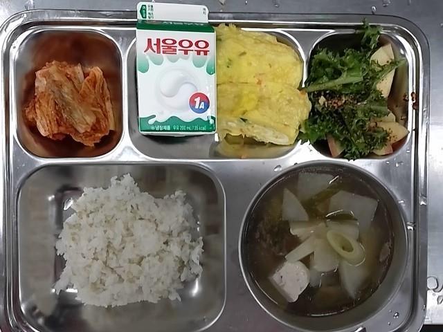 조식: 녹미밥, 소고기무국, 야채계란말이, 치커리사과무침, 배추김치, 우유