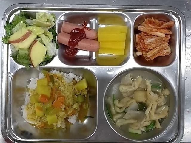 석식: 카레라이스, 유부어묵국, 치커리사과샐러드, 스틱단무지, 배추김치, 후랑크소시지