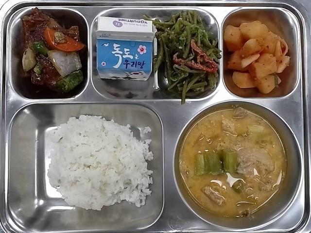 조식: 쌀밥, 콩비지김치찌개, 고구마순볶음, 언양식바싹불고기피망볶음, 깍두기, 요거타임포도