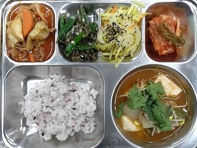 중식: 혼합10곡밥, 동태찌개, 제육볶음, 멸치꽈리볶음, 감자채카레볶음, 배추김치