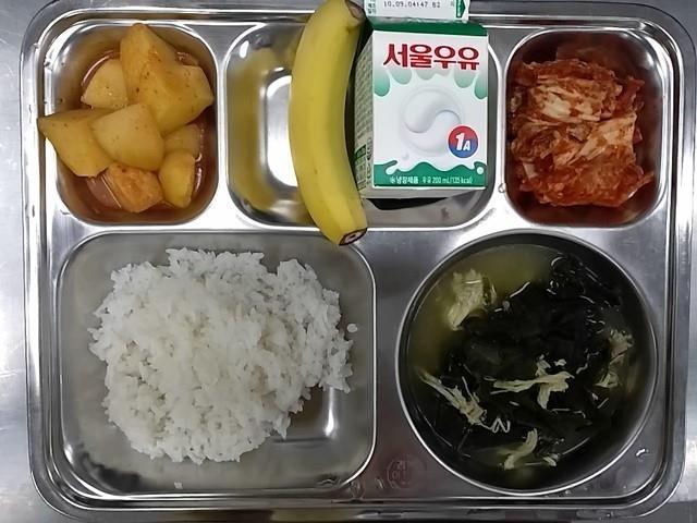 조식:쌀밥, 닭미역국, 감자매콤조림, 배추김치, 바나나, 우유