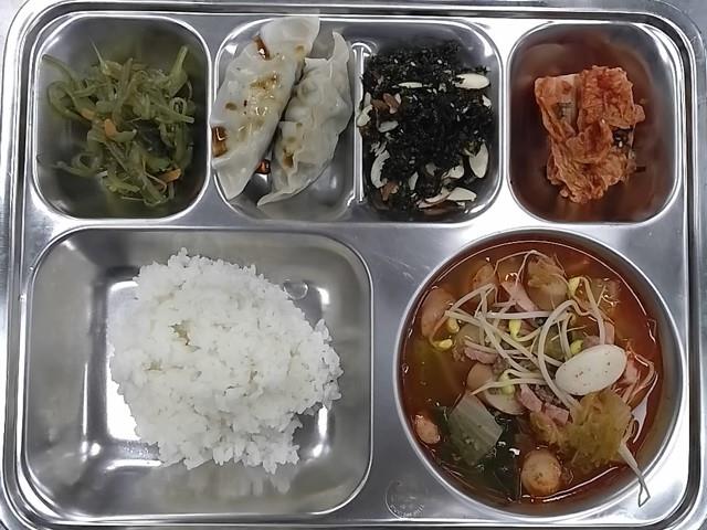 중식: 발아현미밥, 돈육김치찌개, 새송이어묵조림, 가자미데리야끼소스구이, 구운김(자율), 총각김치, 골드키위