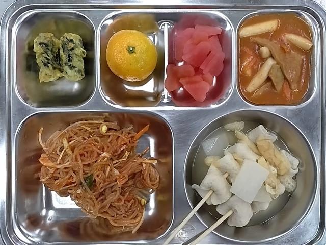 중식: 쫄면채소무침, 꼬치어묵국, 김말이/떡볶이, 단무지, 귤
