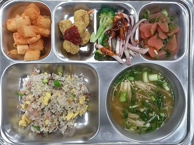 석식: 소고기볶음밥, 팽이된장국, 오징어브로콜리숙회, 황금알카츠, 깍두기, 단무지무침