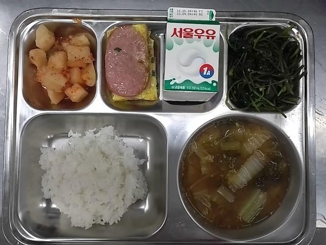 조식: 쌀밥, 바지락배추된장국, 취나물된장무침, 햄전/토마토소스, 깍두기, 우유